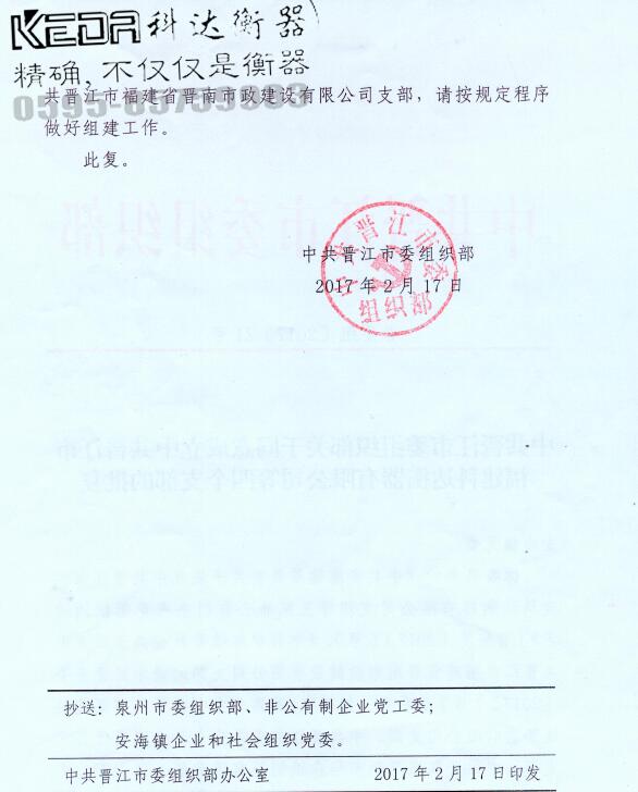 你委送來的《中共安海鎮(zhèn)委員會關于成立中共晉江市福建科達衡器有限公司支部等三家非公有制企業(yè)黨組織的請式》